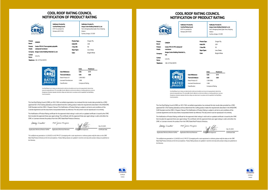 國際凱倫 | 凱倫TPO/PVC防水卷材通過美國冷屋面評級委員會(CRRC)產品評級認可